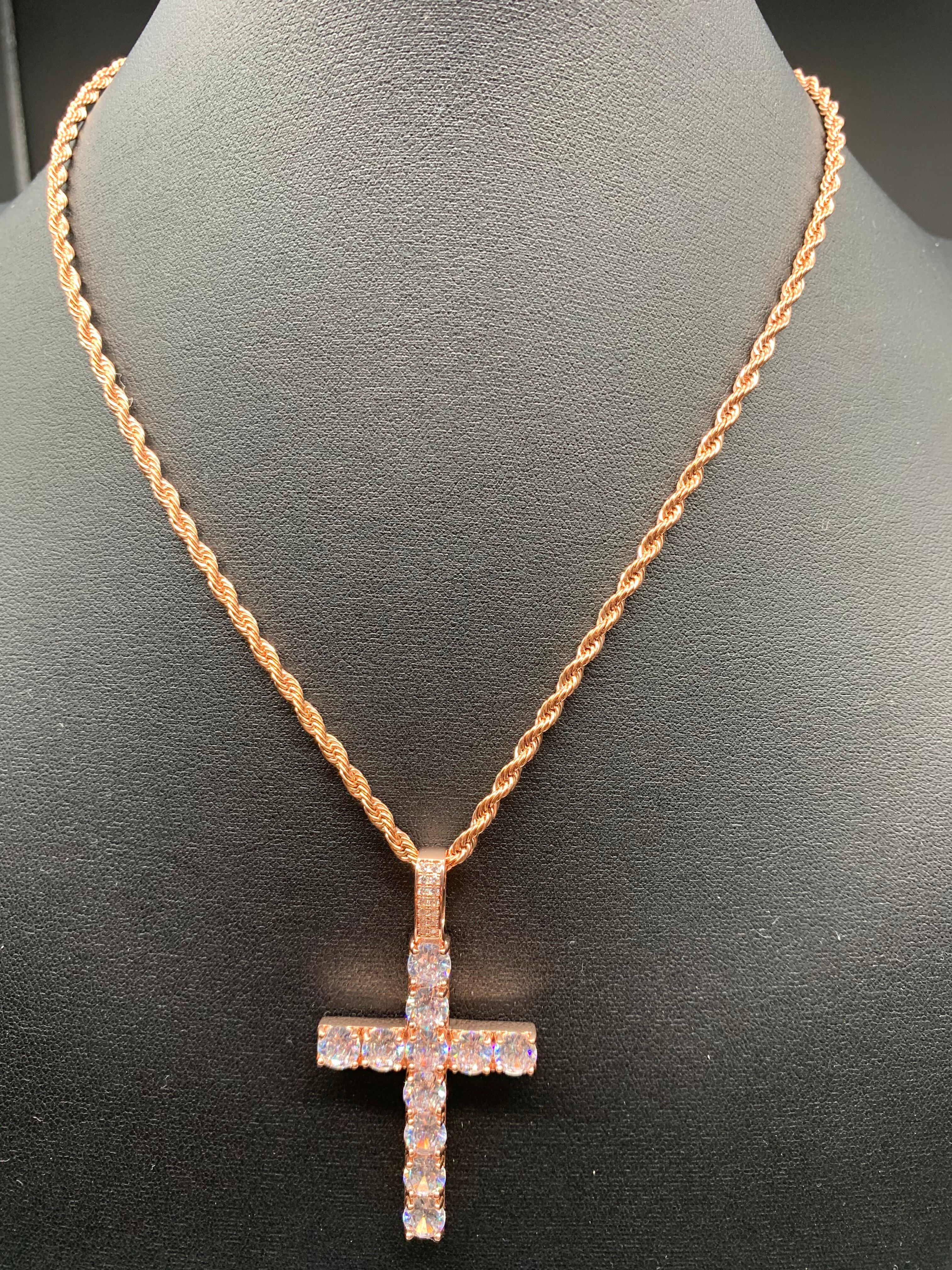 ピンク ローズ カラー 大粒 ジルコニア クロス 十字架 ネックレス ロザリオ